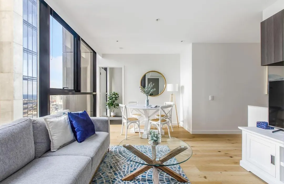 広々とした63m²のAqua Verde - Chic City Stay Near Yarra River & Crown メルボルンアパートにはサンテラスがあり、Vincent Designから徒歩で5分の場所に位置しています。 メルボルンの中心に位置する寝室2室のアパートは、オーストラリア映像博物館から2キロメートルです。